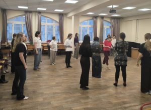 Параллельно участники могли посетить мастер-класс по музыкальному движению А.М. Айламазьян «Переживание музыки в движении как опыт целостного бытия личности». Основным содержанием работы по методу музыкального движения является переживание музыки двигательно и телесно. Речь идет не о простом ритмическом соответствии, а о глубоком восприятии музыкального произведения и отражении его смыслов в движении.