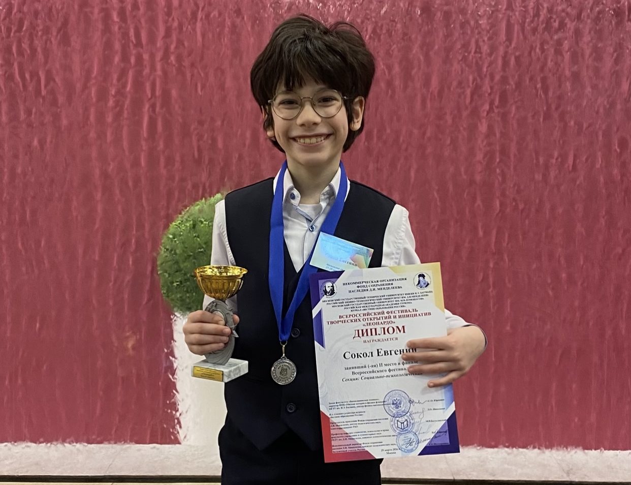 С 27-29 марта 2026г. в г. Москва прошел Всероссийский фестиваль творческих открытий и инициатив «Леонардо», в котором ученик 4-го класса МБОУ СОШ «Мозаика» Евгений Сокол с работой «Восприятие собственной ошибки в учебной деятельности как источника развития детьми младшего школьного возраста» в Социально-психологической секции занял II место.